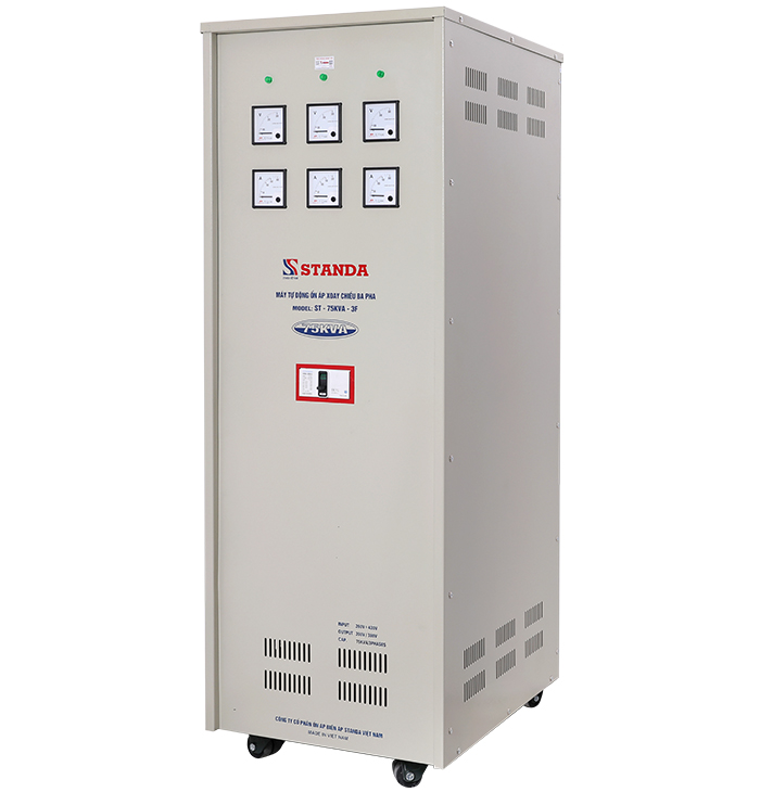 - Standa 75kVA 3 pha hoạt động theo nguyên lý điều chỉnh động cơ giúp dòng điện ổn định liên tục.